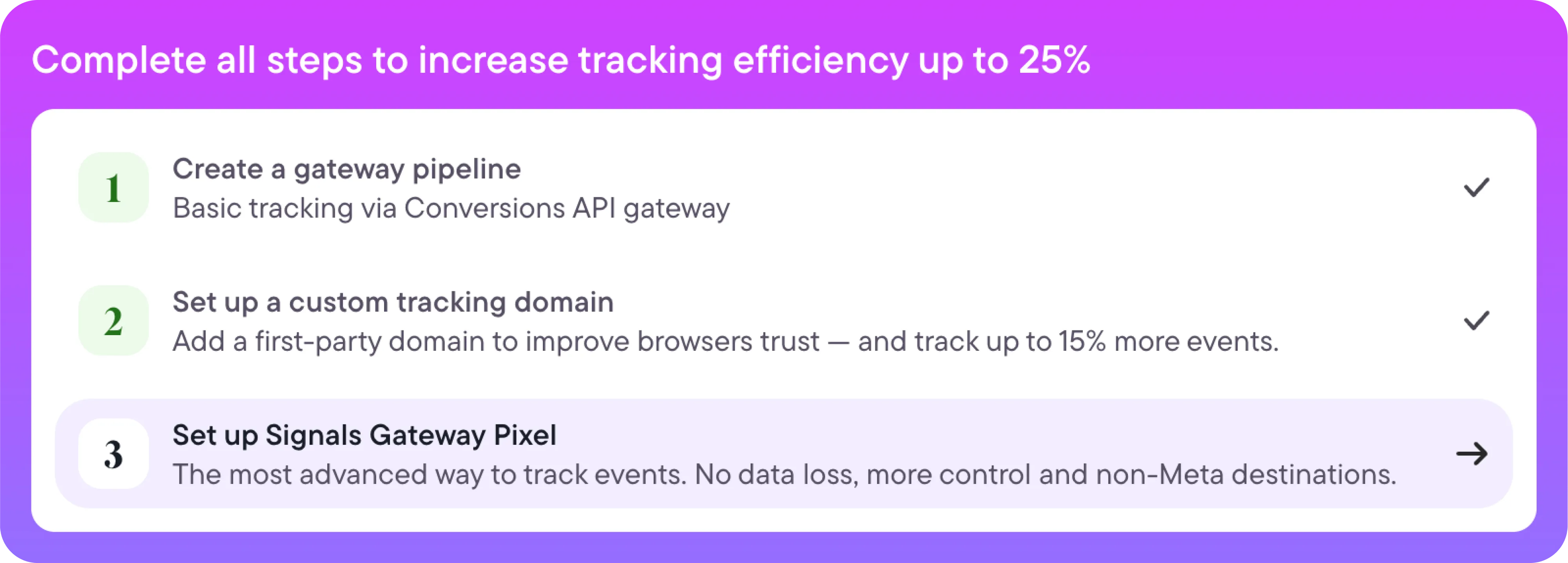 A managed setup hosts the gateway for you. Instead of configuring servers and DNS records, you simply link your Meta account and drop the pixel into your site while the provider handles updates, scaling, and security.