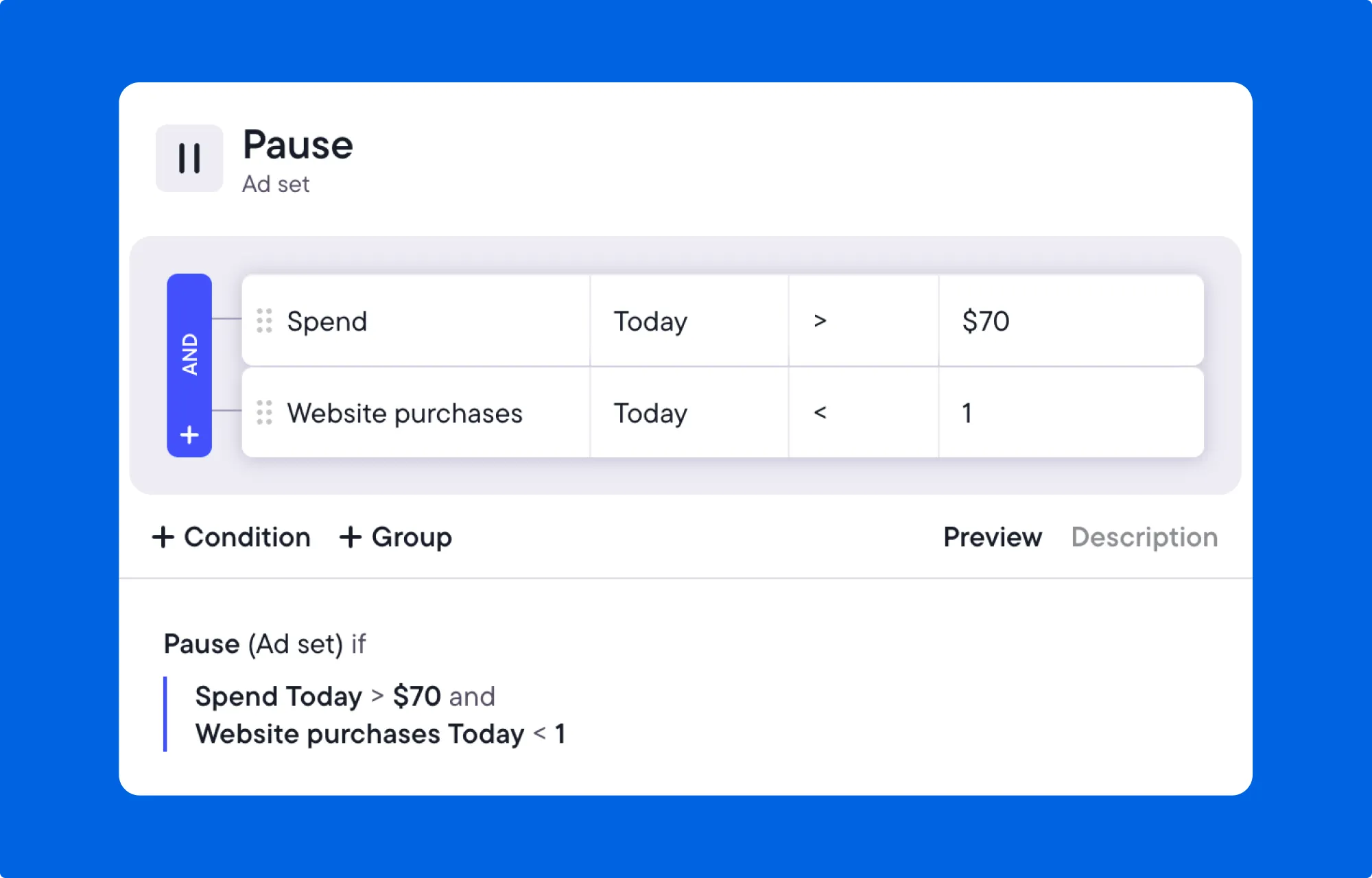 Spend > $70 and ROAS < 3Which means that this ad set will pause if more than $70 is spent and recorded purchase revenue is less than $210 ($70 x 3).