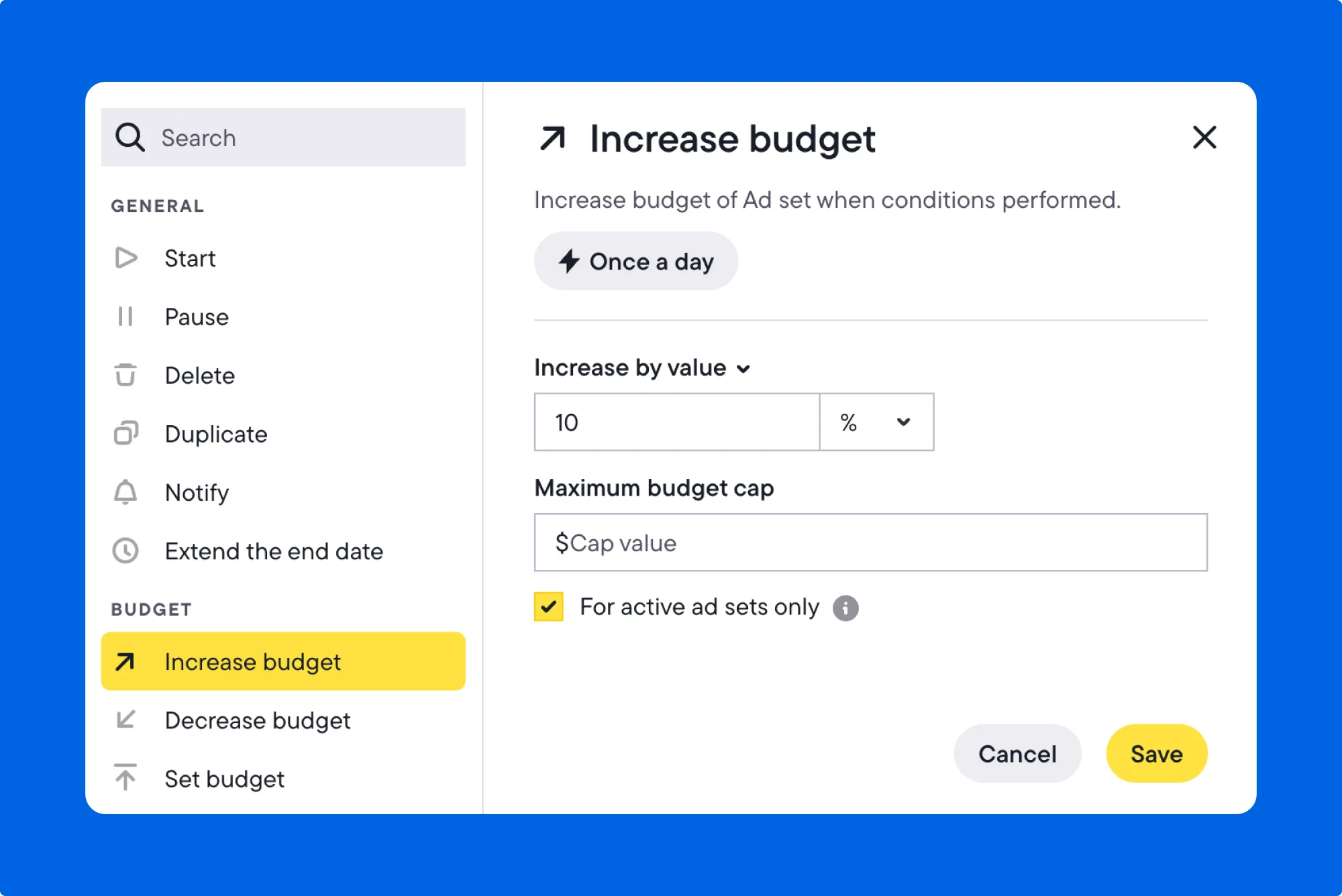 - Increase, decrease, or set the budget (by value or percentage)