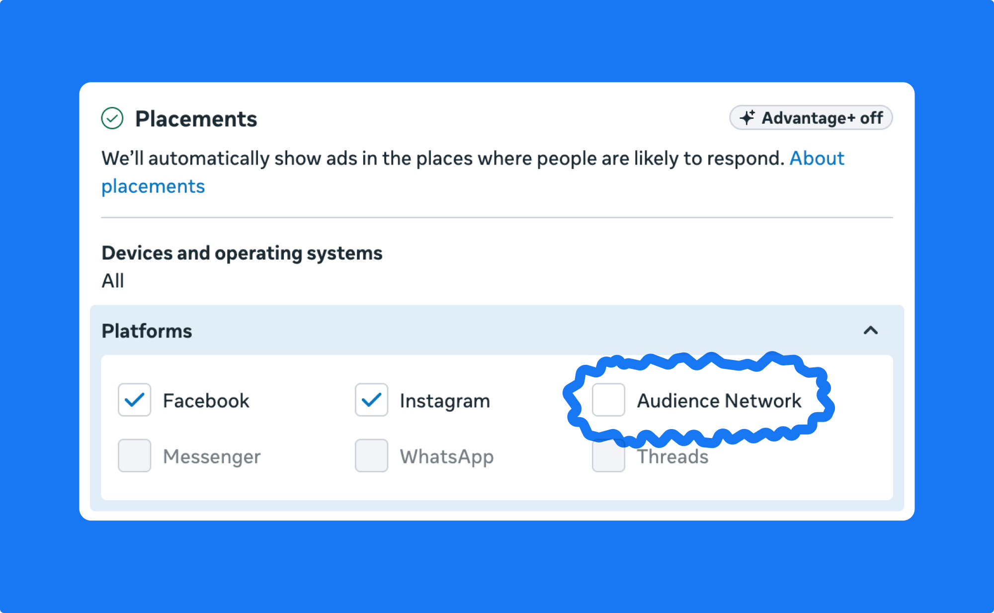- Run Audience Network in separate ad sets to isolate results and control spend.
