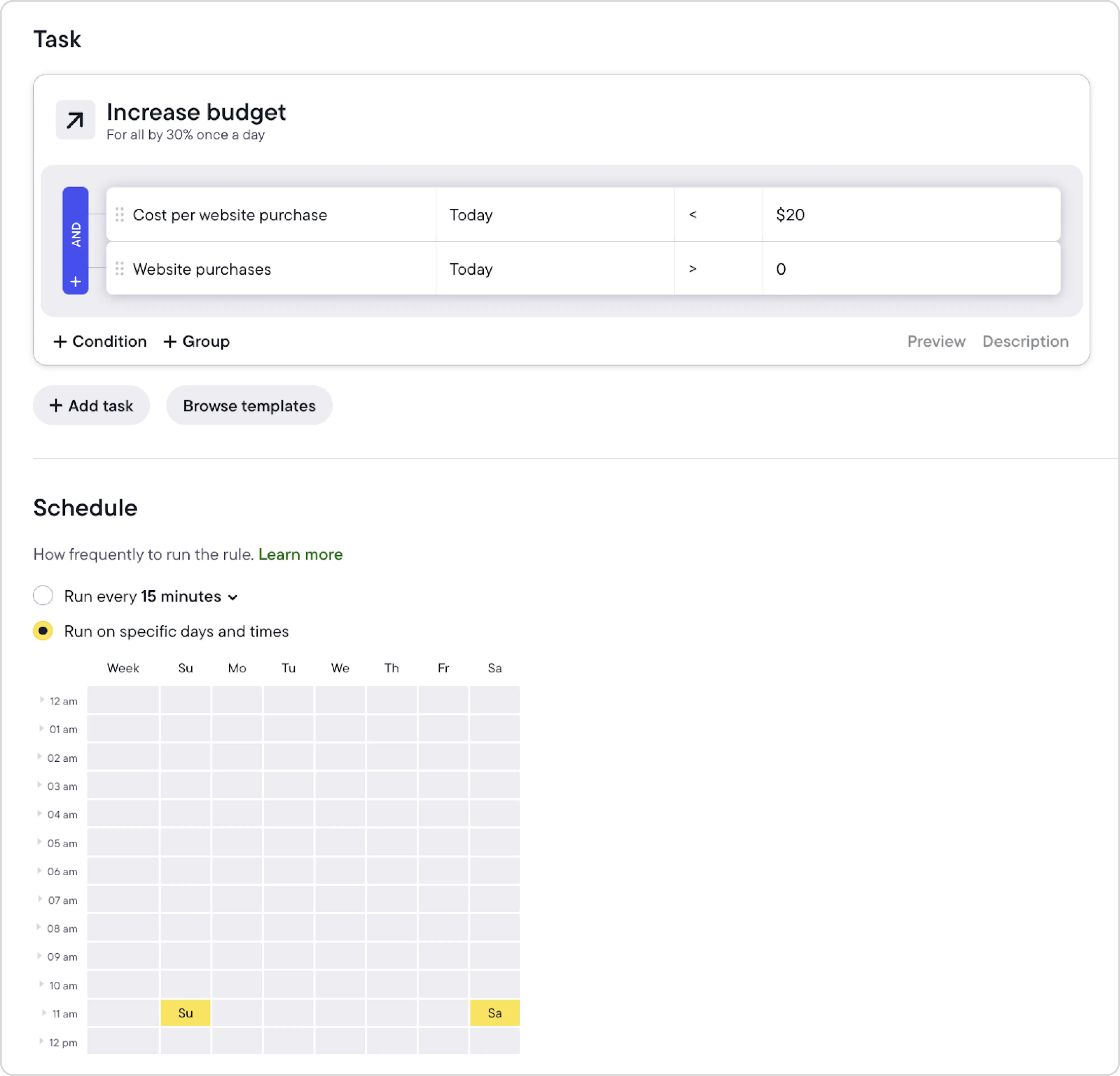 You can also set a custom schedule to run checks only during specific time slots. For instance, if your ads tend to perform better on weekends, you might set up a special weekend rule to scale budgets more aggressively during that time.