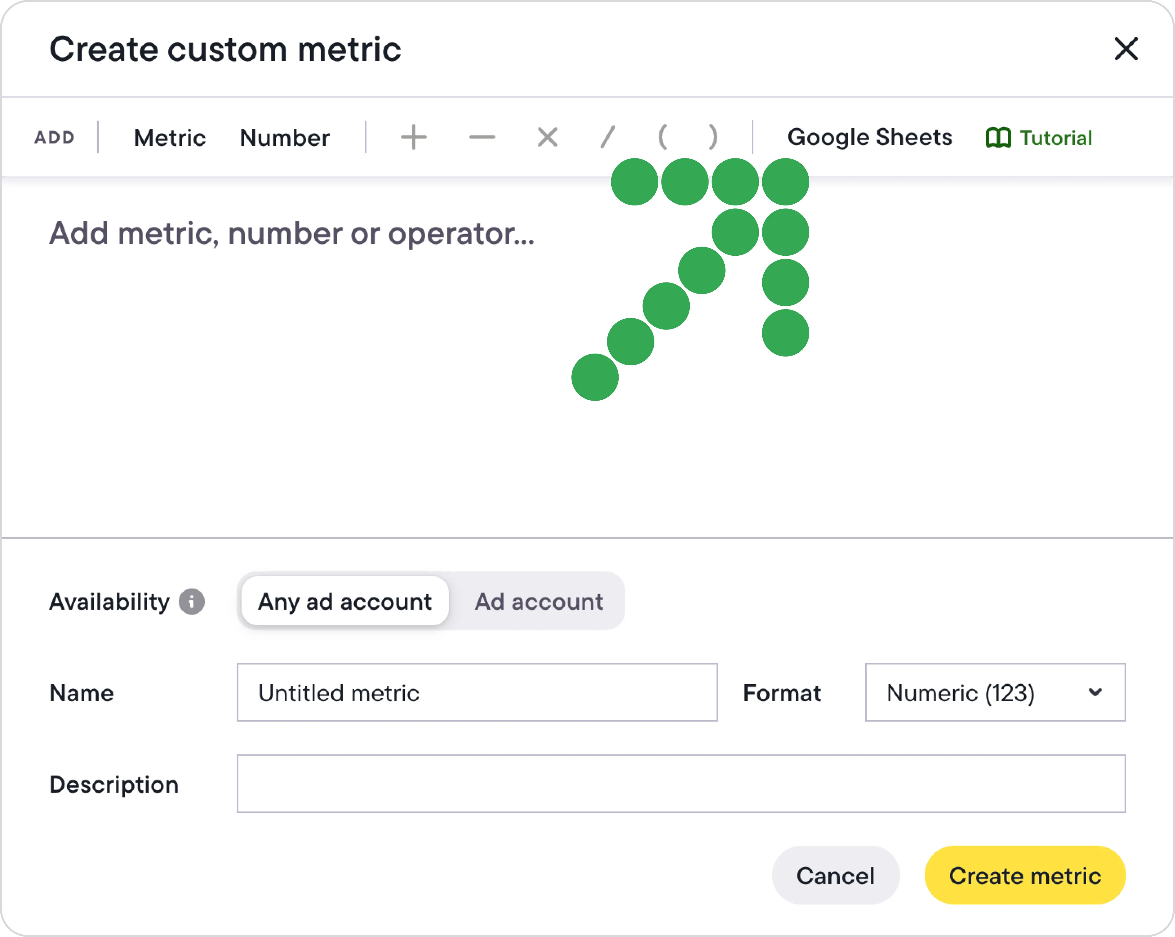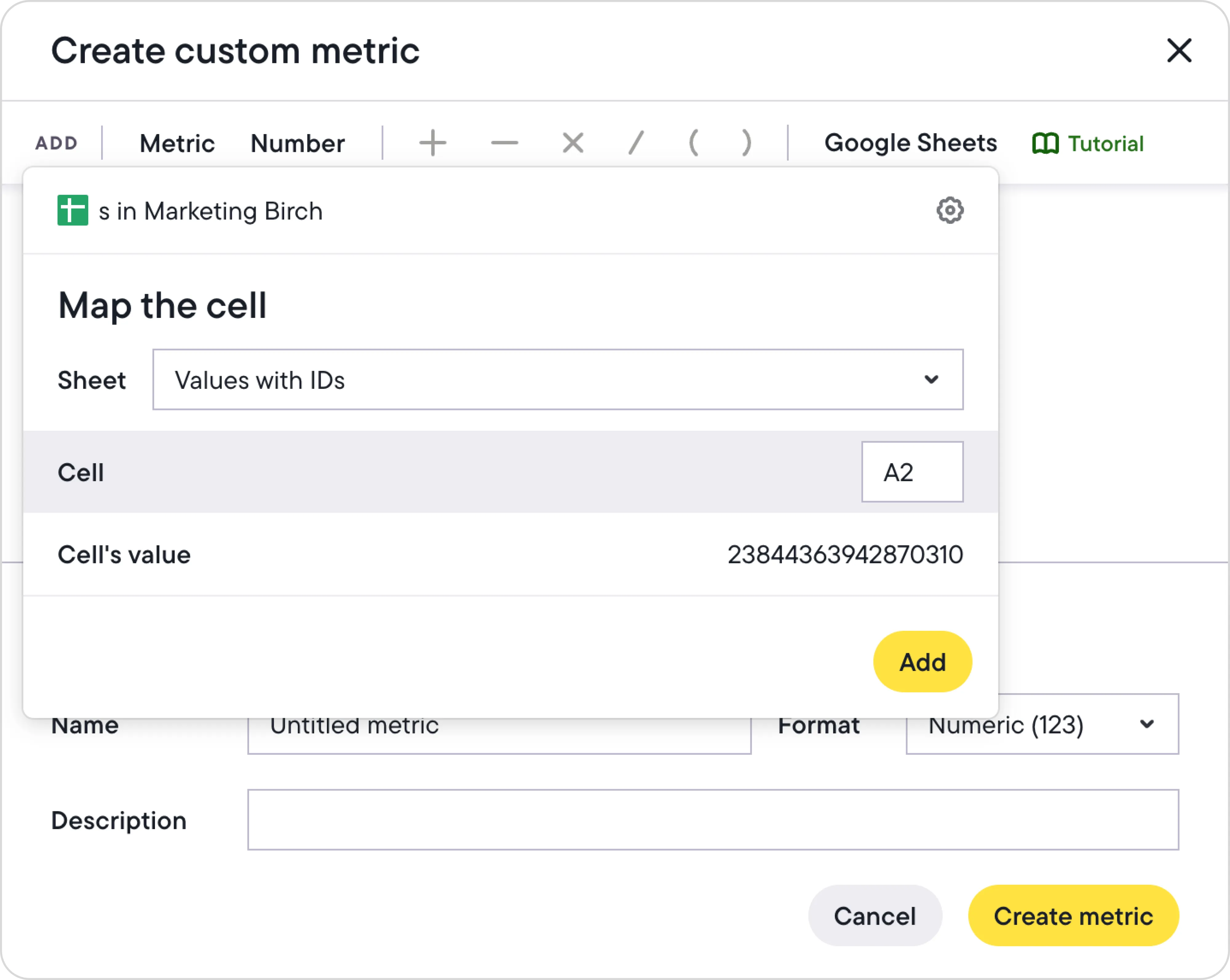 In Bïrch, go to the custom metrics tab and select “Google Sheets”.