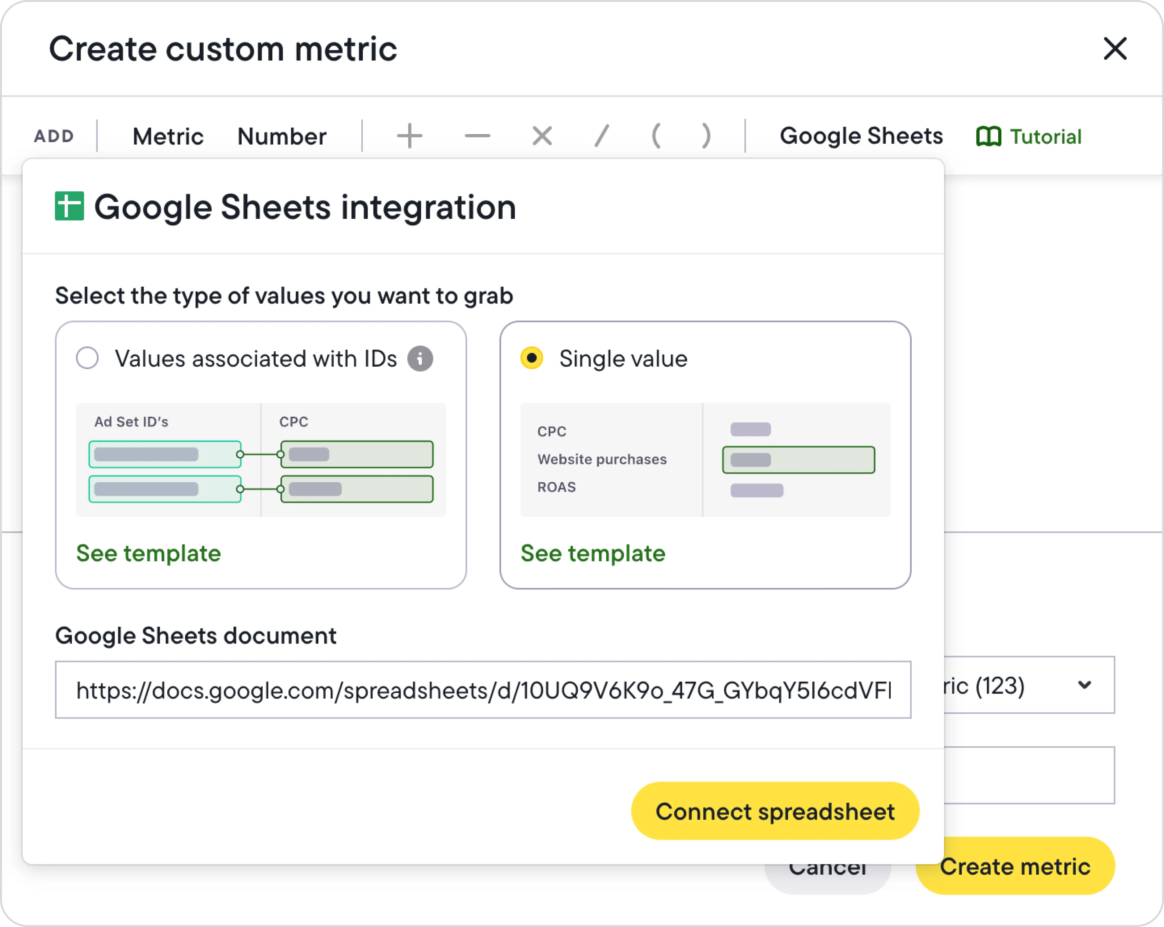 • Single value: This mode is designed for more general strategies, when you need to take action on several items based on one total value. For example, if you want to pause all active campaigns if your total ad account budget has been spent, you would need to use just one cell containing your total budget, e.g. “B2”