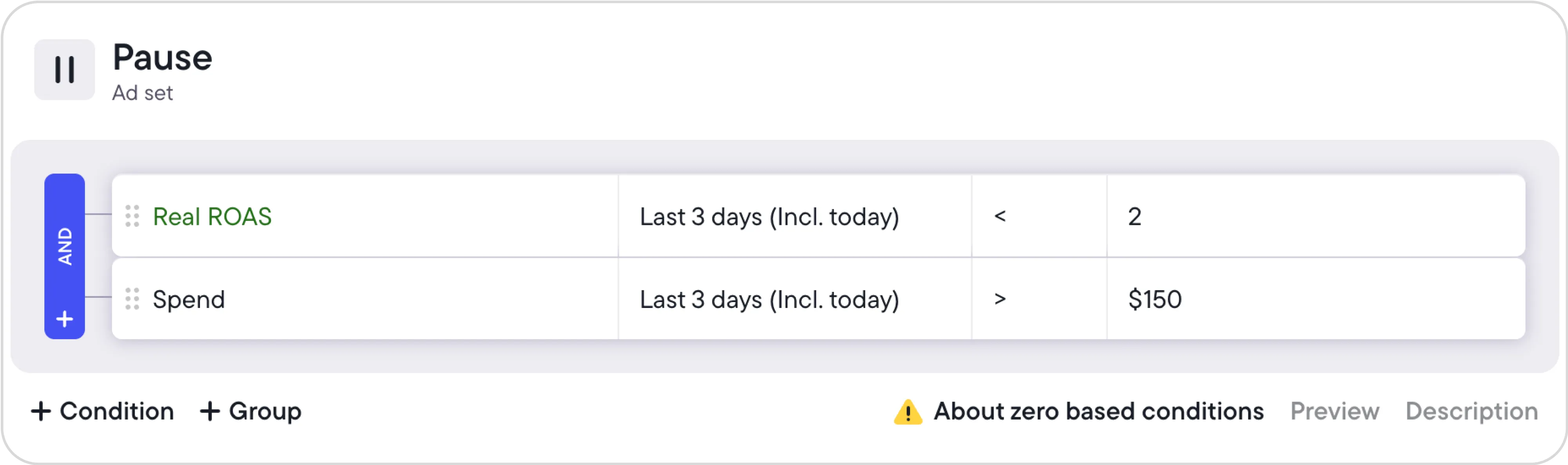 Select which campaigns, ad sets, or ads you want to check, set the action (like pausing or increasing budget), build conditions based on your metric (e.g., pause ad sets with Real ROAS under 2 and spend over $150 in the last 3 days), and schedule how often the rule runs.