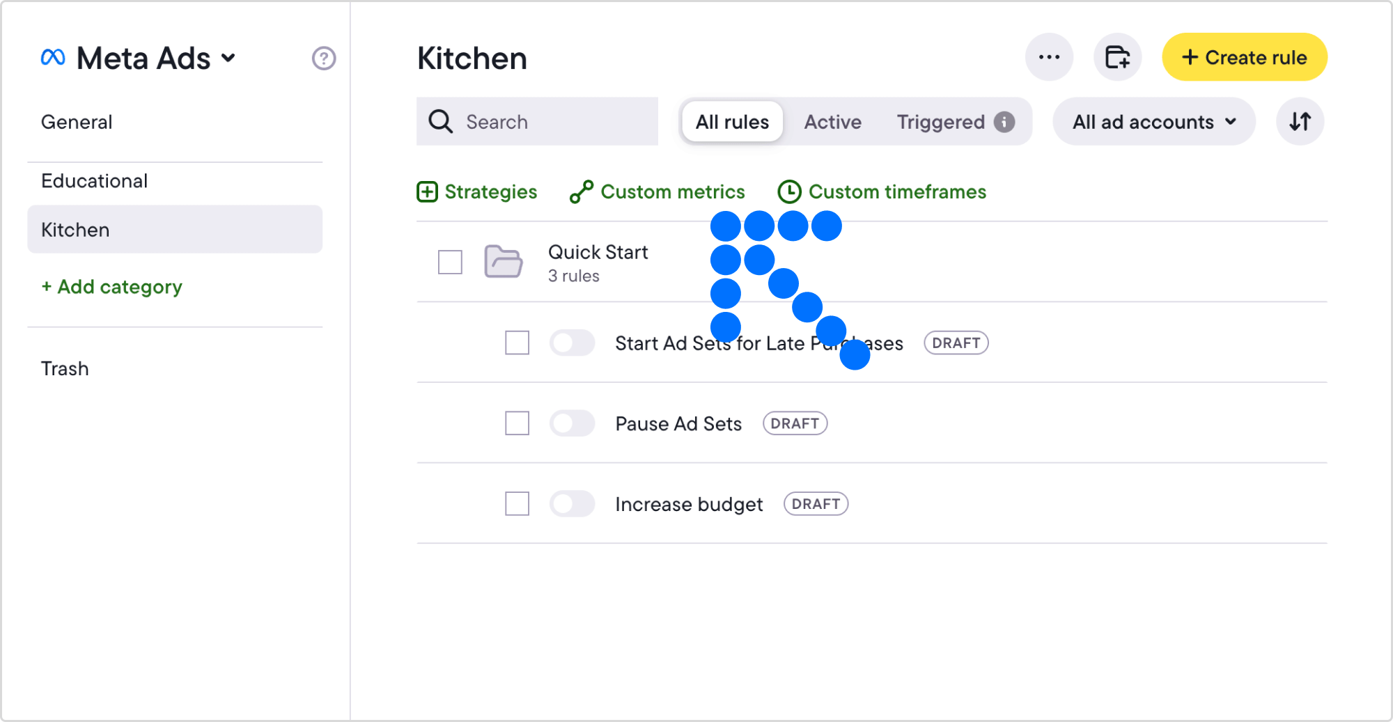 Automation tools let you set pacing rules and adaptive budgets based on live ROAS data, automatically reallocating spend, adjusting bids, and pausing underperforming ads to keep your campaigns efficient.