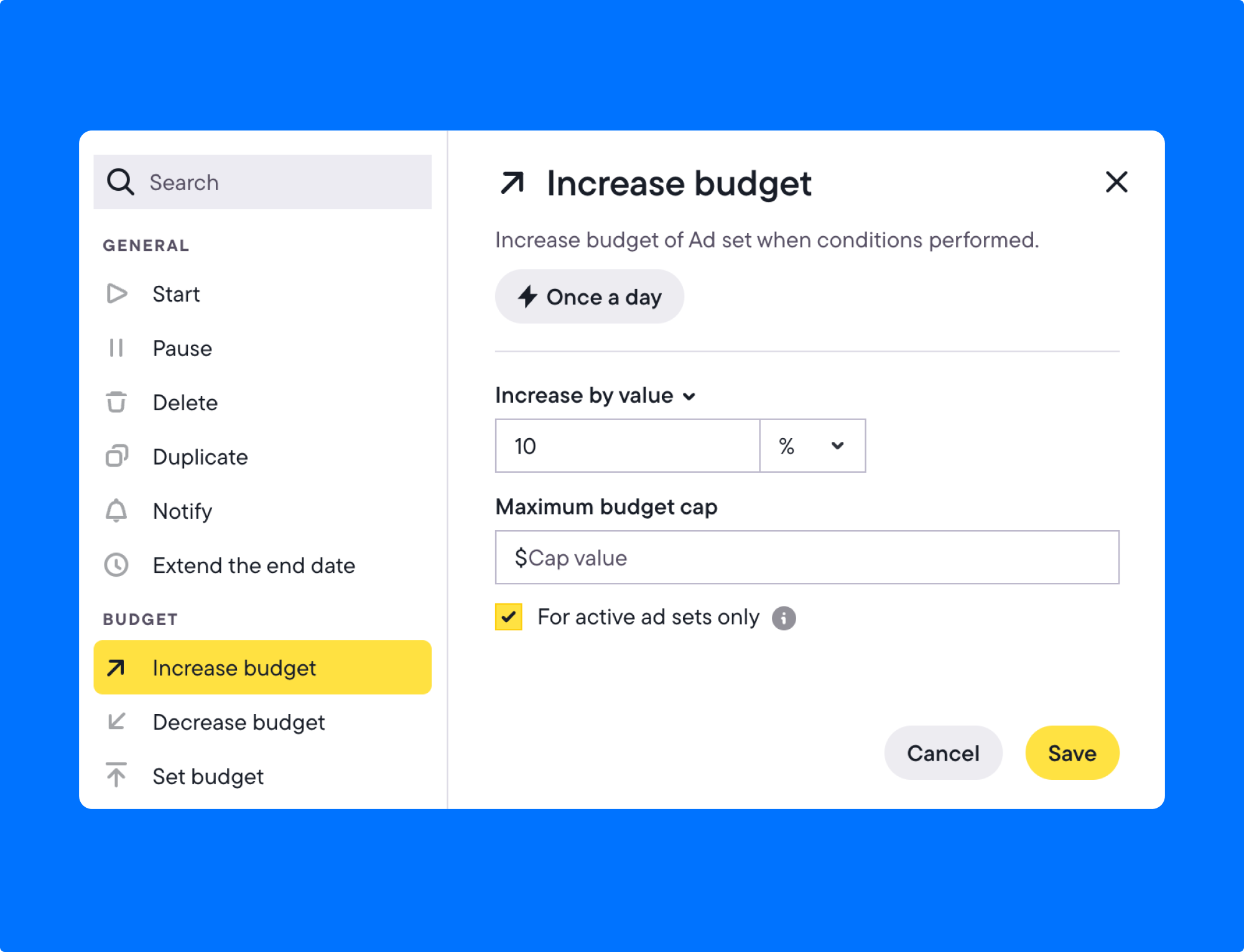 - Choose the action, such as increasing the daily budget by 20% (you can select percentage, fixed value, or custom metric). You can also choose to set a maximum budget cap.