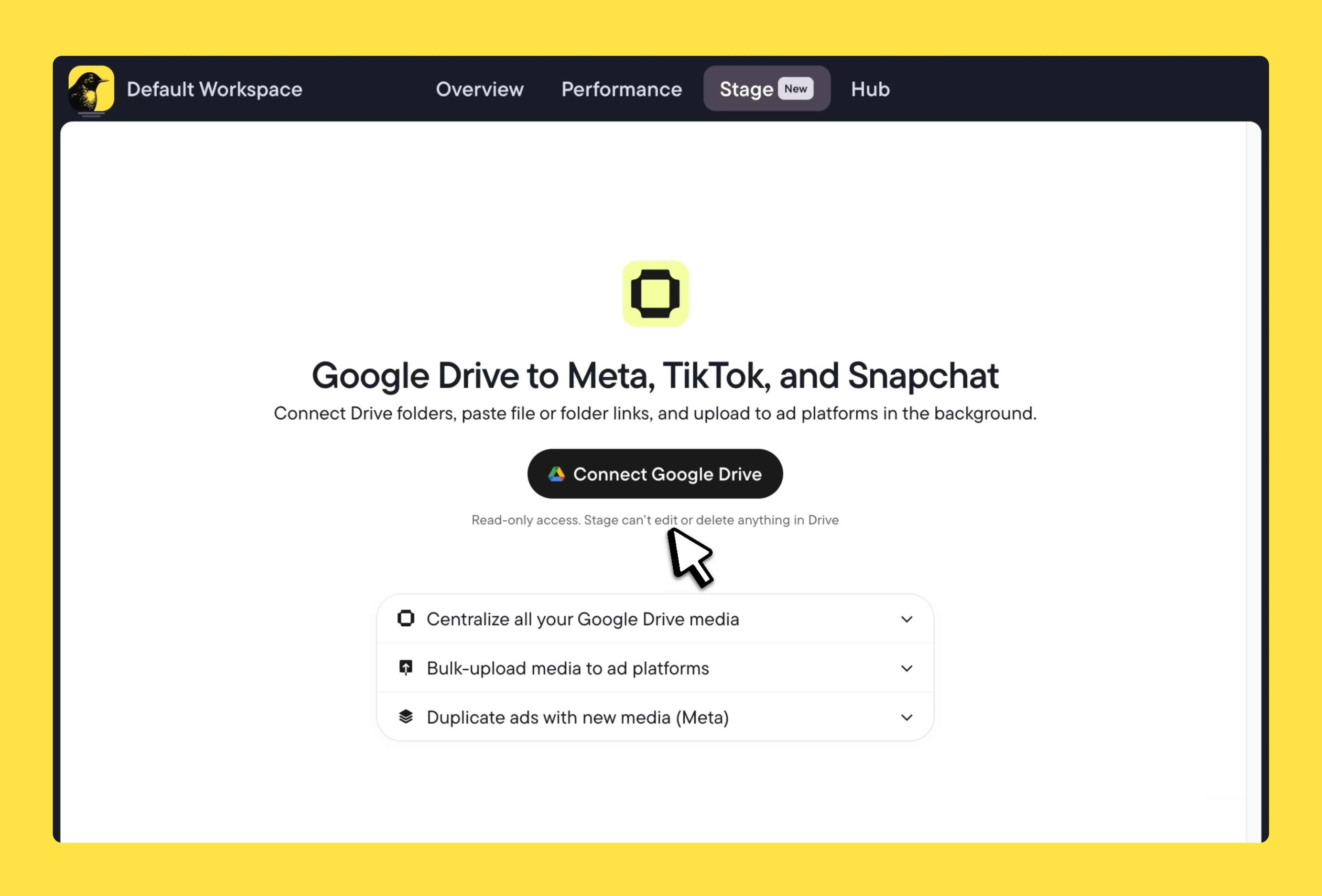 Launcher lets you upload creatives in bulk directly from your computer or Google Drive. If your team works from shared Drive folders, Stage connects those folders directly to the upload flow via shared link, so assets move from Drive to your ad account without anyone downloading or re-uploading them.