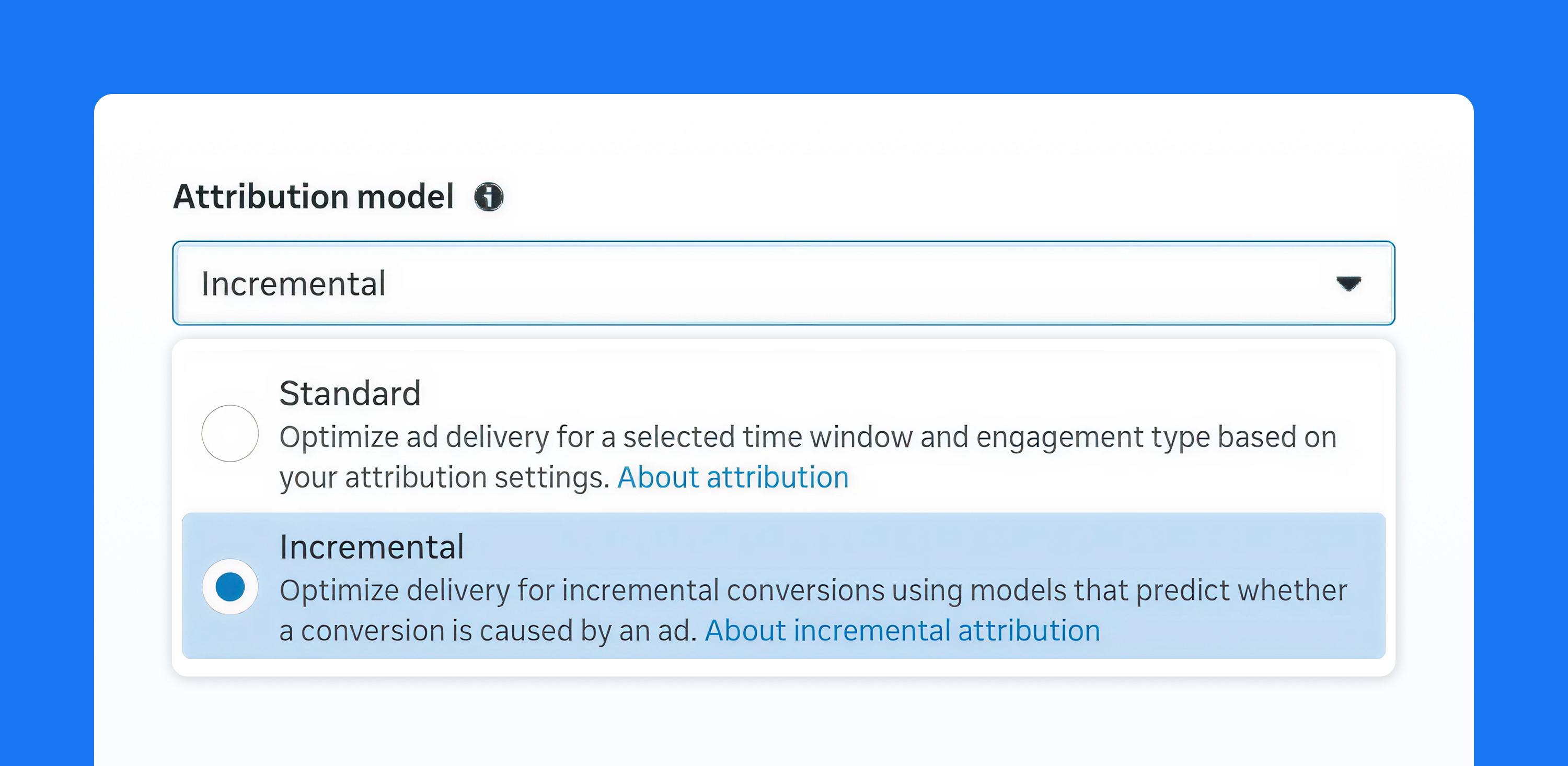 When creating an ad set in Meta Ads Manager, you can choose between two attribution models: standard and incremental.