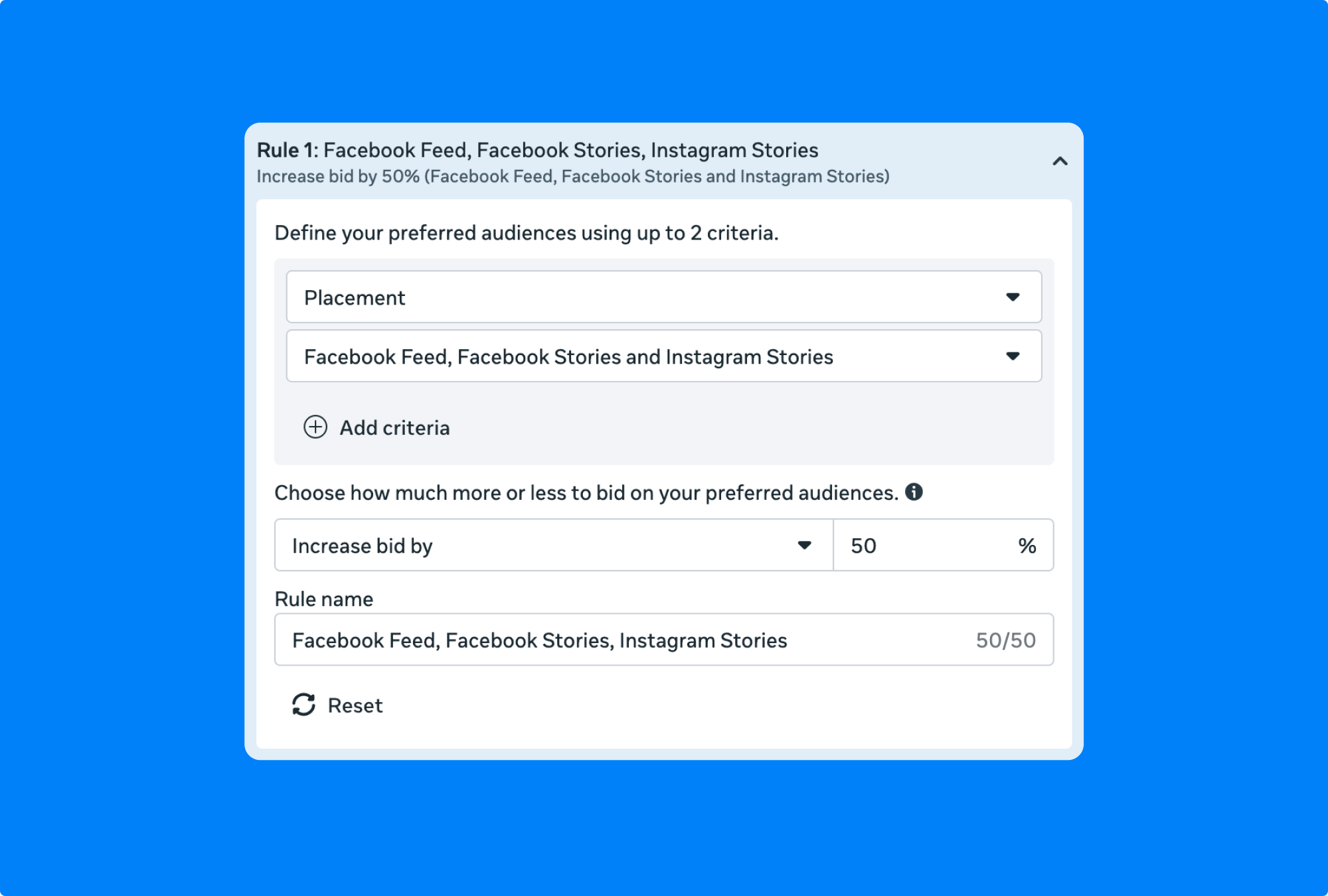 Meta has extended value rules to work at the placement level, meaning you can set unique bid adjustments for specific placements across Facebook and Instagram feed, reels, stories, and audience network.