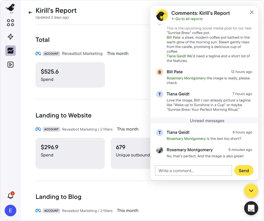 Just click on the Bïrch logo in the bottom right corner and start new threads: discuss reports with clients and colleagues, select the best posts for Post Boosting, customize Rules together and keep an eye on what's important in Workspaces.