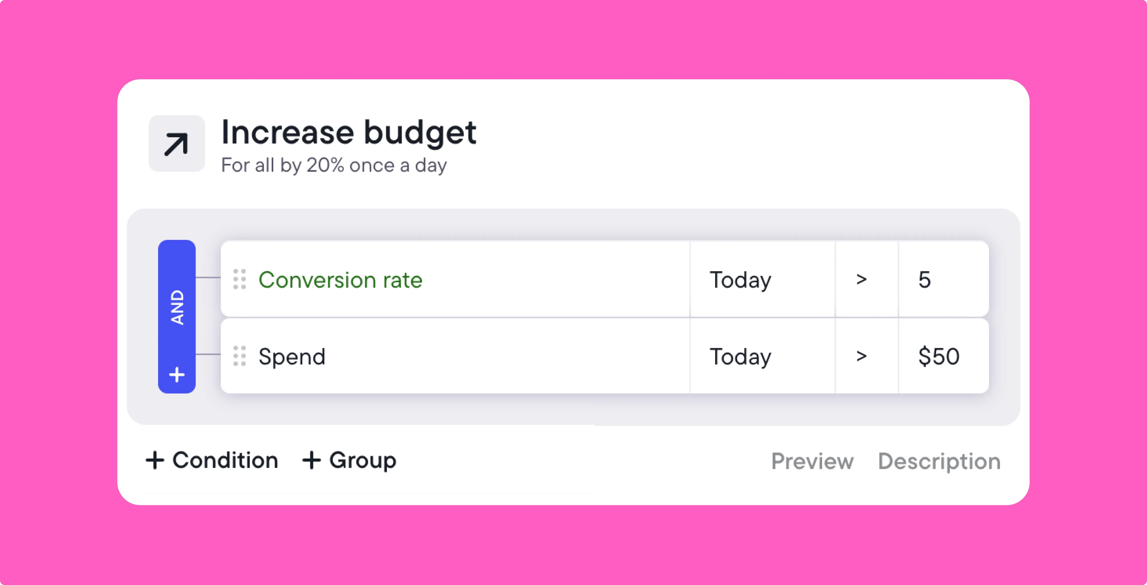 You can chain multiple conditions together, use AND/OR logic, and even choose over 130 metrics to be one step ahead with your goals. The result is a seamless loop; Creative Center gives you the ideas, while Bïrch keeps your campaigns performing at their best, automatically.